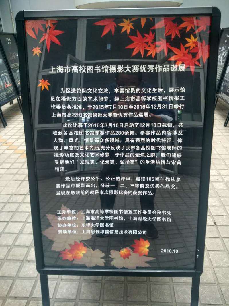 上海市高等学校图书情报工作委员为展示本市高校图书馆事业的发展和广大图书馆馆员的艺术修养,促进馆际文化交流,特组织上海市高校图书馆摄影大赛的优秀作品在上海高校图书馆中巡展,并于5月22日起在济光学院展出。