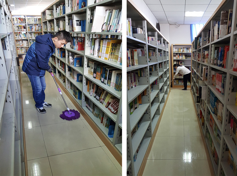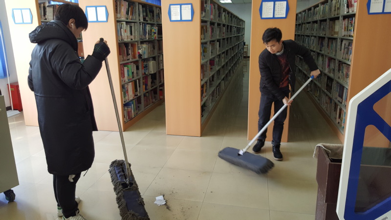 三月的天气,中午的太阳已经十分热辣,但闷热的空气、飞扬的灰尘这些都挡不住志愿者同学内心的火热心情,在大家默契的协作配合下不出多长时间就已经将图书馆的地板、书架扫除干净。